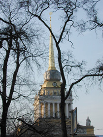 The Admiralty (the spire in the foreground), was founded by Peter the Great in 1704 to be a fortified shipyard in the hopes that it would build his Navy as Peter hoped to dominate Europe from the Gulf of Finland. It stands on the western end of Nevskiy Prospekt. The Admiralty is currently occupied by a Naval College. Behind the Admiralty, you can see the spire of the cathedral at Peter and Paul Fortress, the original military fort that founded St. Petersburg.